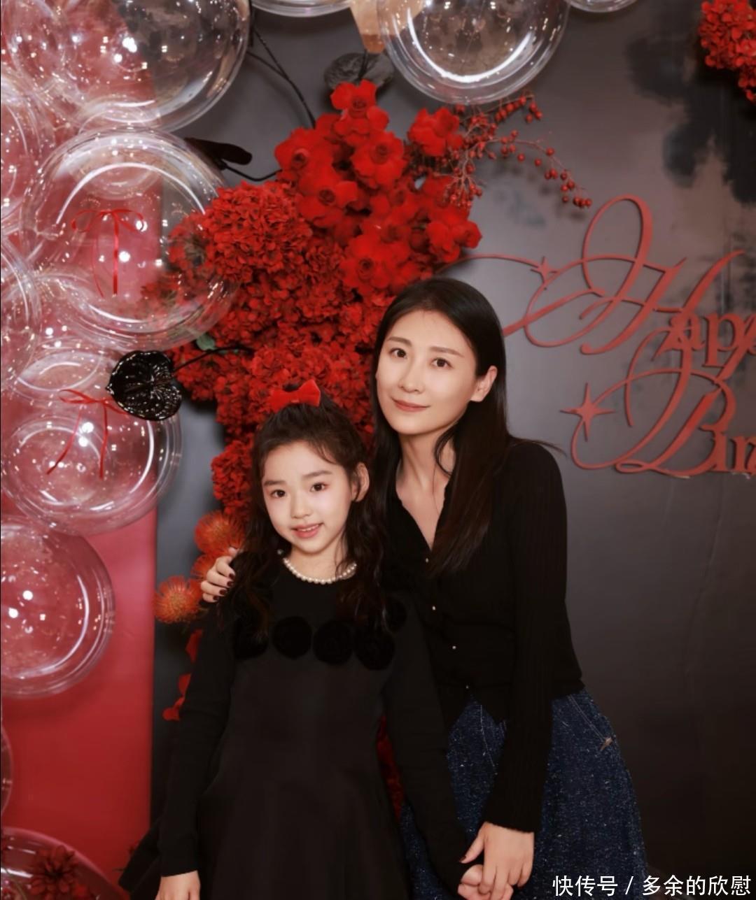 现场那氛围,黑底红玫瑰,整得挺神秘。董璇一袭黑色长裙,头发盘起,配上红唇,真有点老港片里女主角的味道。她女儿小酒窝也穿了黑裙子,小小一个站在妈妈旁边,像个小公主,模样随妈,眼睛鼻子都长得特别秀气。母女俩站一块儿,画面挺温馨,一看就是精心搭配过的。不过大家盯着的可不是穿搭,而是董璇的腰身——怎么看着比以前圆了一圈?尤其是她跟化妆师靠得近那张,肚子往前凸得挺明显,手臂挡都挡不住,穿的衣服又贴身,根本藏不住。